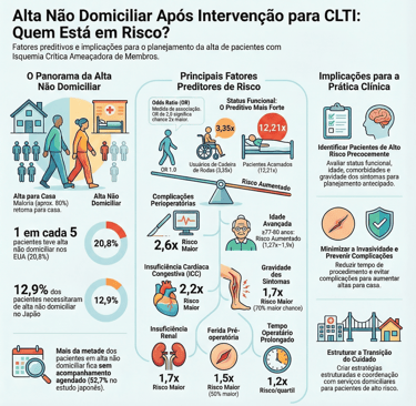 • Comorbidades e Gravidade: A presença de insuficiência renal, insuficiência cardíaca congestiva (CHF), diabetes e feridas abertas antes do procedimento aumenta as chances de uma alta não domiciliar.
