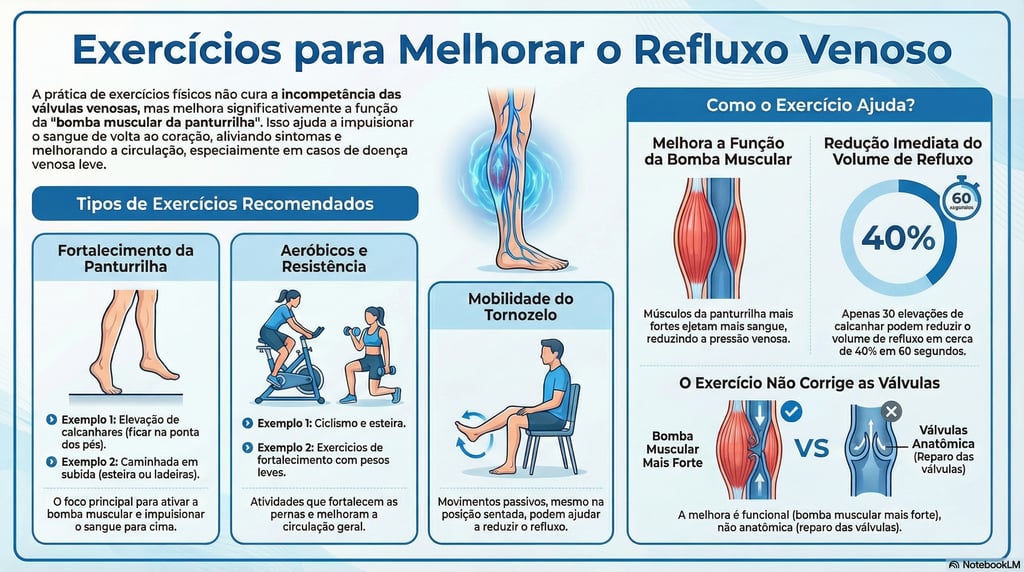 Observação sobre o volume de exercício: É importante notar que o excesso de atividade pode ter o efeito oposto. Treinamentos de alto volume (mais de 8 horas por semana de atividade vigorosa) estão associados a um aumento no calibre das veias e a um maior volume de refluxo, caracterizando o que se chama de "veias de atleta".