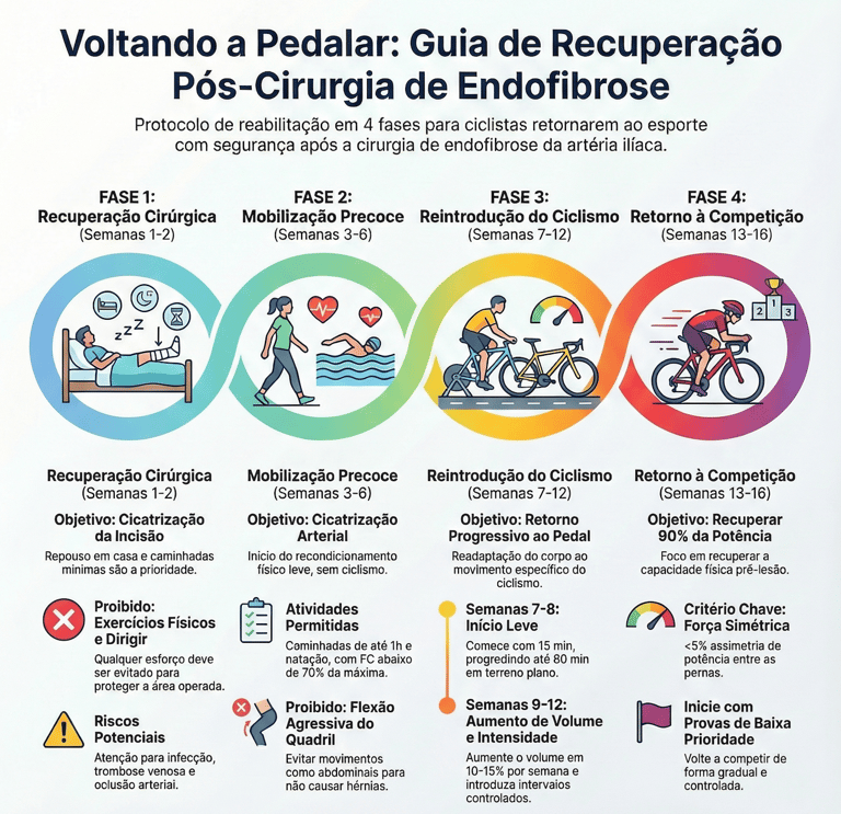 O roteiro de reabilitação e retorno ao treino após a cirurgia de endofibrose da artéria ilíaca é dividido em quatro fases progressivas, focadas na cicatrização, recondicionamento e retorno seguro à performance competitiva.
