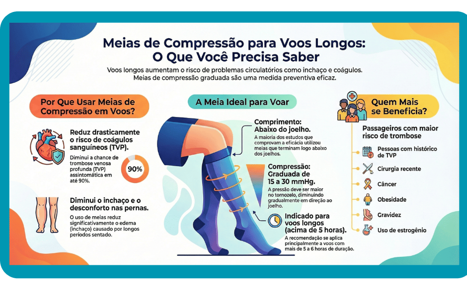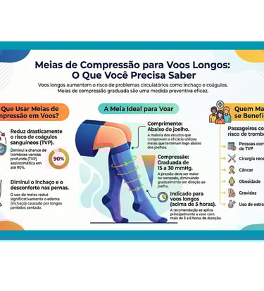 As diretrizes internacionais, como as do Colégio Americano de Pneumologia (ACCP), recomendam fortemente o uso de meias para passageiros em voos de longa distância (geralmente acima de 4 a 6 horas) que apresentem: