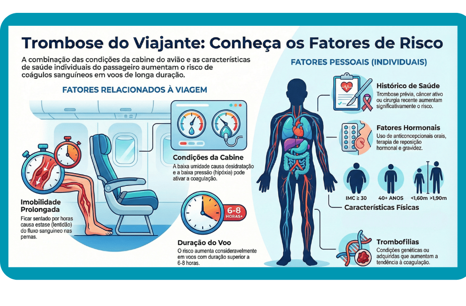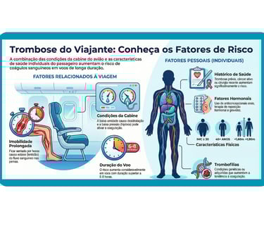 • Hormônios e Gestação: O uso de anticoncepcionais orais (que podem elevar o risco em até 40 vezes durante o voo), terapia de reposição hormonal e o estado de gravidez ou pós-parto.