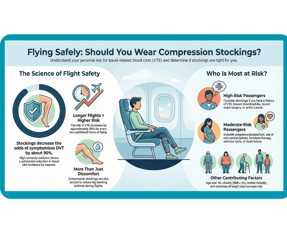O uso de meias elásticas de compressão em voos é especialmente recomendado para passageiros que possuem fatores de risco para o desenvolvimento de tromboembolismo venoso (TEV), embora passageiros saudáveis também possam se beneficiar da redução do inchaço e do desconforto.